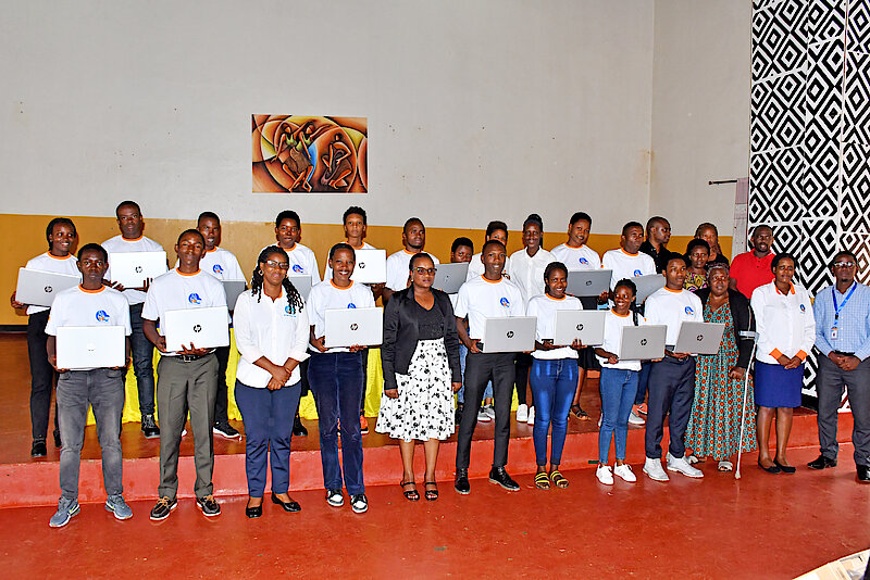 Abana 18 batsinze neza ibizamini bisoza amashuri yisumbuye bitoza umwuga wo kwigisha bashyikiriwje mudasobwa.