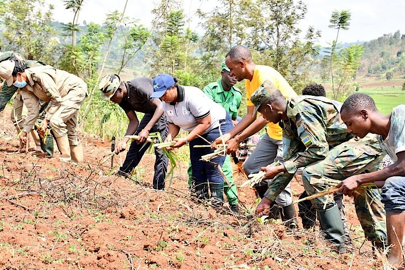 Abayobozi, inzego z'umutekano bifatanyije n'abaturage mugutera ibiti bifata ubutaka mu gukumira isuri