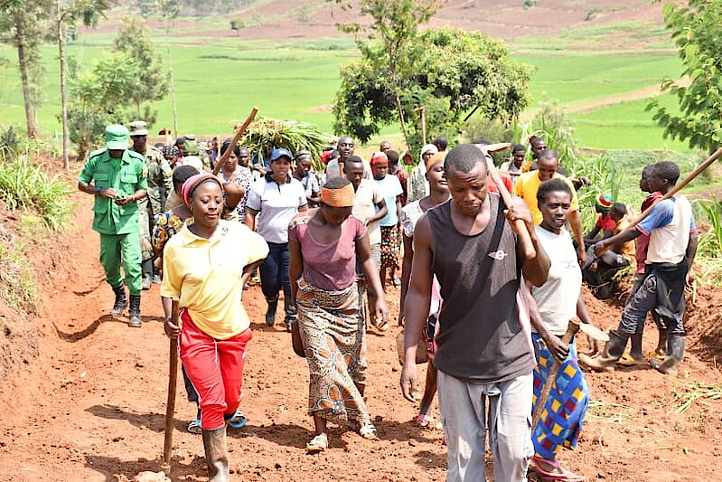 Kimwe nahando hose mu gihugu uyu munsi kuwa gatandatu taliki 24.09.2022 Umuyobozi w'Akarere NIYONAGIRA Nathalie ari kumwe n'abagize inzego z'umutekano yifatanyije n'Ubuyobozi bw'Umurenge wa GASHANDA mu muganda usoza ukwezi kwa Nzeri wabereye mu Kagari ka Mutsindo ahacukuwe inzira zikumira amazi yajyaga kwangiza imirima y'abaturage ndetse hanaterwa ibiti by’urubingo ku mirima bifata amazi bikarwanya isuri ukunda gutwara ubutaka.