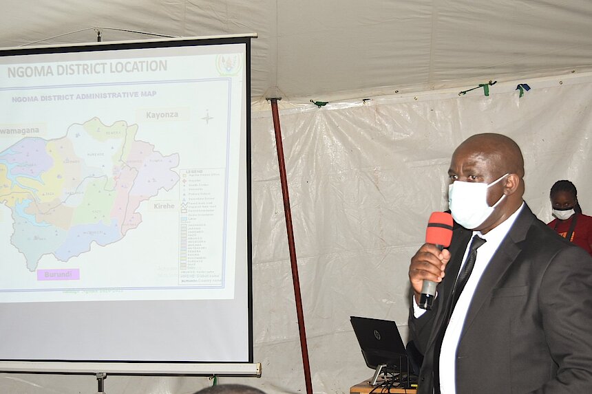 Bwana NAMBAJE Aphrodise umuyobozi w'Akarere ka Ngoma yagaragarije abitabiriye inama uko Akarere kesheje imihigo 202/2021