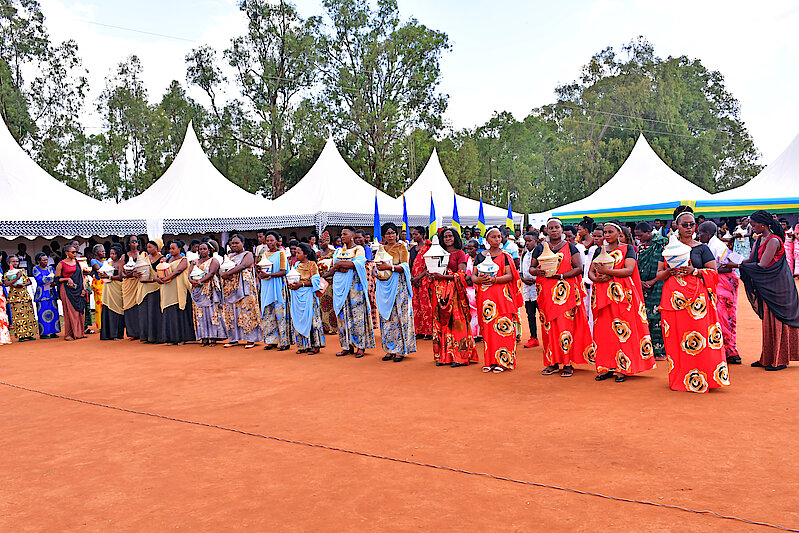 Ababyeyi bari bambaye umwambaro wa Kinyarwanda bitwaje Agaseke k'Amaharo.