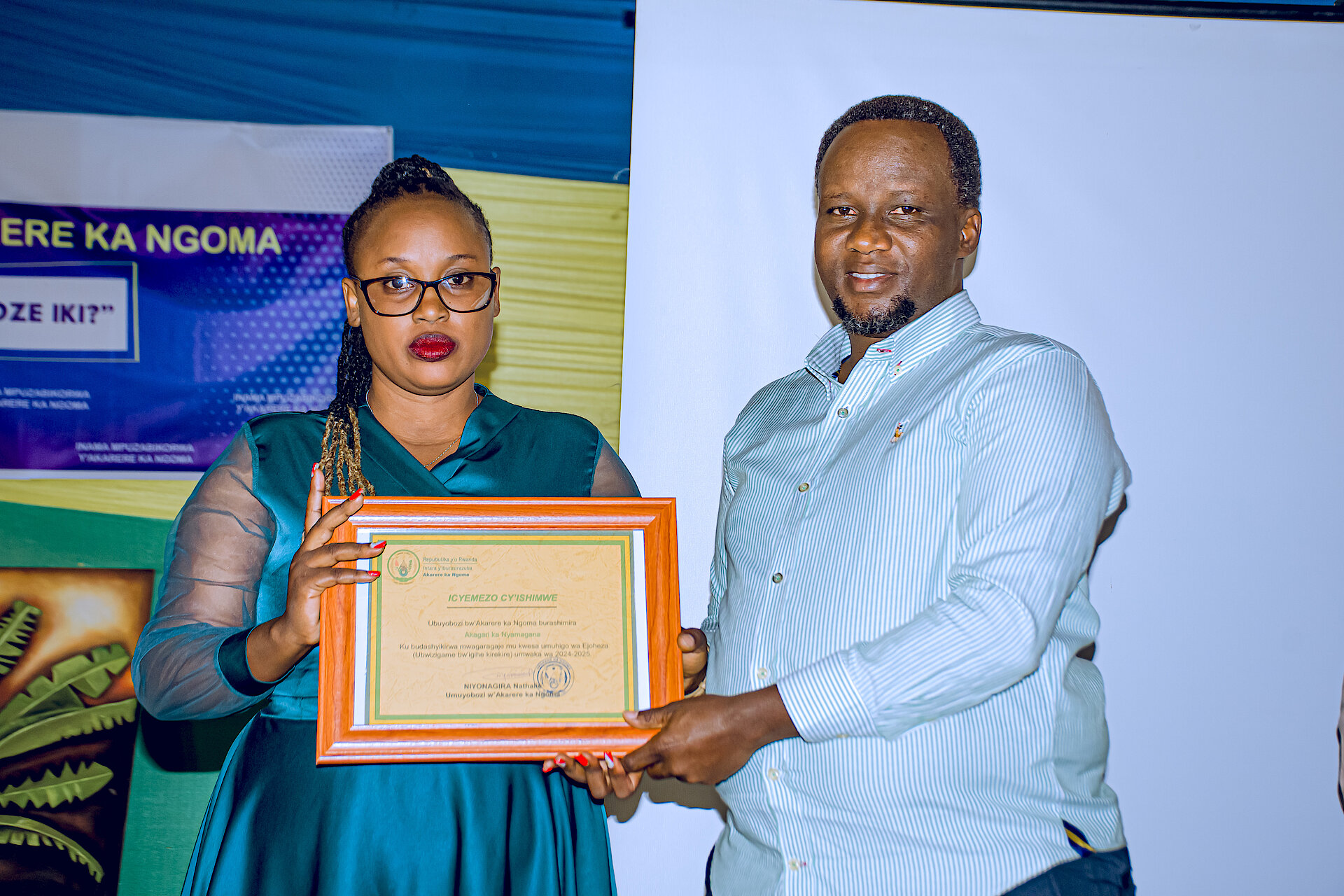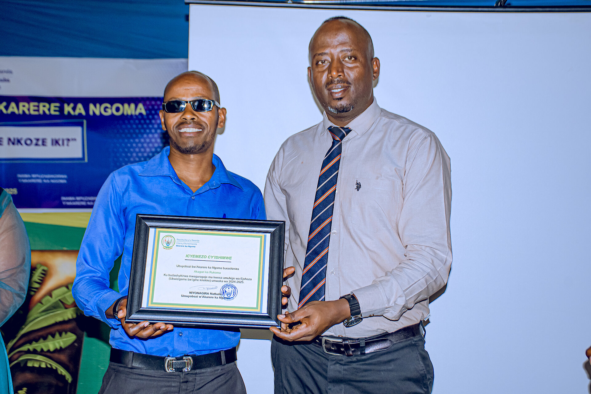 Umuyobozi w'Akarere wungirije ushinzwe iterambere ry'Ubukungu MAPAMBANO NYIRIDANDI Cyriaque yashyikirije icyemezo cy'ishimwe Umunyamabanga Nshingwabikorwa w'akagari wahize abandi mu kwizigamira muri EjoHeza.