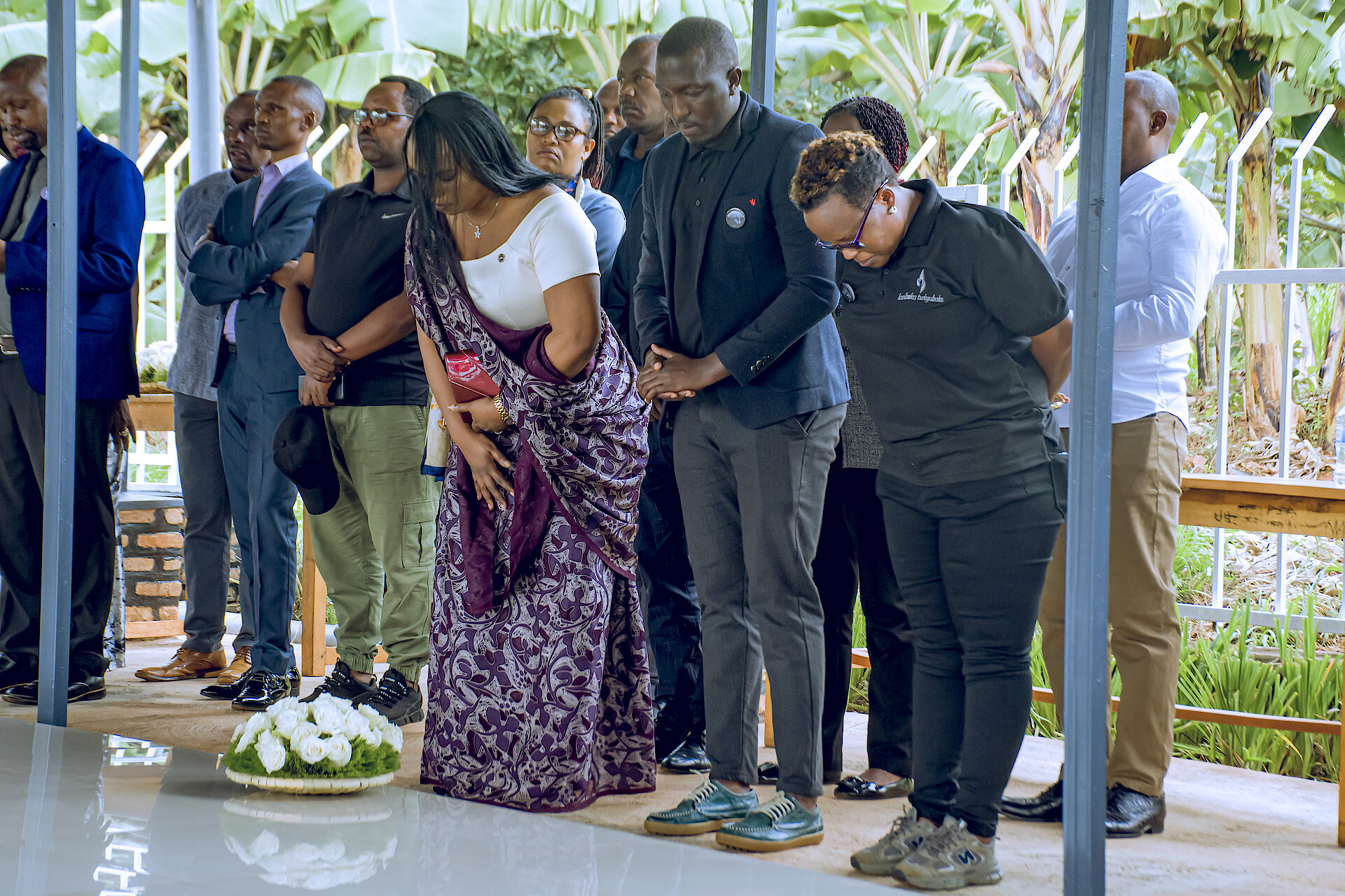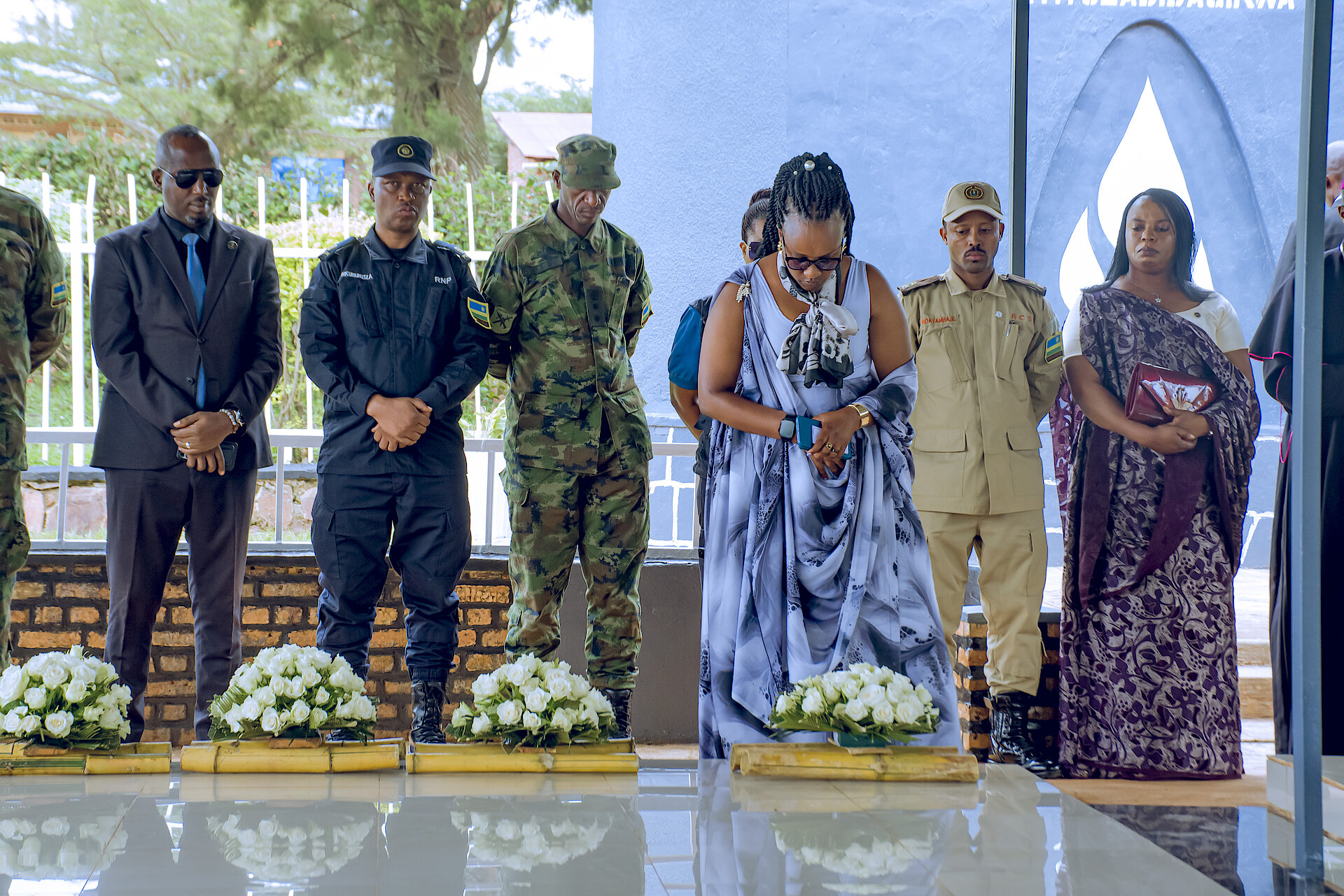 Umunyamabanga w'Inama Njyanama MUSABWASONI Marie Grace Sandra ari kumwe n'abandi Bajyanama b'Akarere bunamiye imibiri y'abatutsi bashyinguye mu rwibutso rwa Jenoside rwa Mutenderi