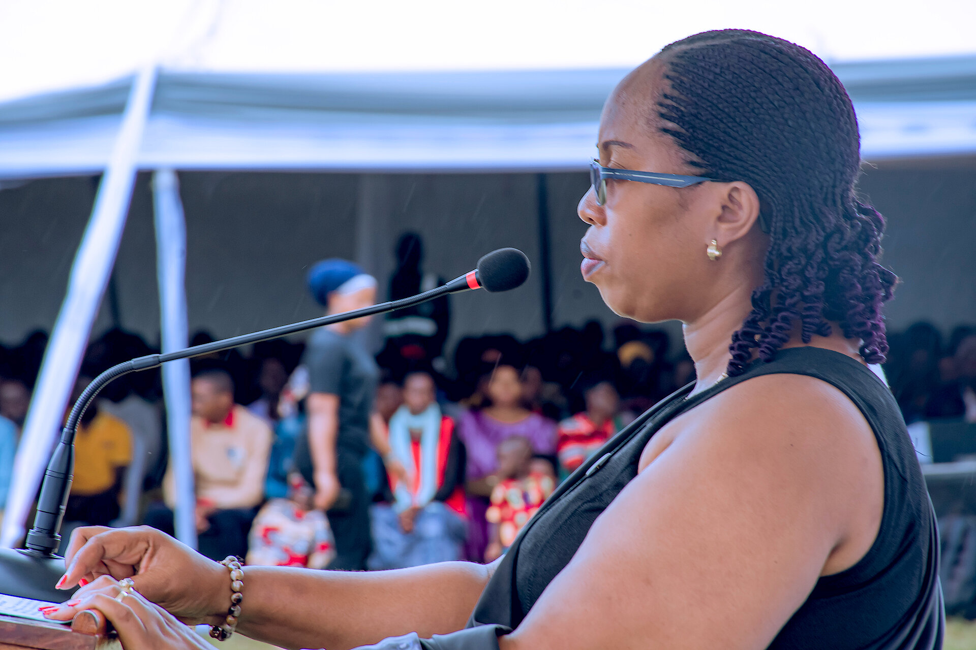 Umuyobozi w'Akarere wungirije ushinzwe imibereho myiza MUKAYIRANGA Marie Gloriose yunamiye imibiri y'abatutsi bashyinguye mu rwibutso rwa jenoside rwa Mutenderi.