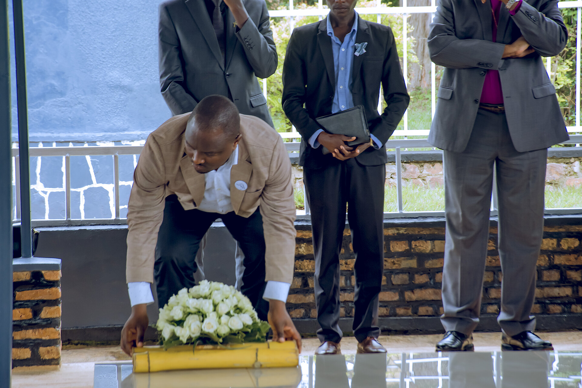 Umuyobozi w'Akarere wungirije ushinzwe iterambere ry'ubukungu MAPAMBANO NYIRIDANDI Cyriaque yashyize ururabo ku rwibutso rwa jenoside rwa Mutenderi yunamira imibiri y'abatutsi iharuhukiye mu rwego rwo kubaha icyubahiro.
